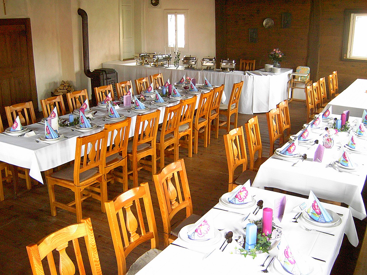 Seit seiner Renovierung im Jahr 2001 steht die Bohlenstube, die sich im 1. Stock befindet, für Familienfeiern und sonstige Veranstaltungen mit bis zu etwa 50 Teilnehmern zur Verfügung. Eine Verköstigung erfolgt gegebenenfalls über den hauseigenen Partyservice. Selbstverständlich sorgen wir auch für alkoholische und alkoholfreie Getränke. Wenn gewünscht, arrangieren wir zudem eine passende Dekoration. Beheizt (soweit notwendig) wird die Bohlenstube auch mittels eines Holzofens, der mit seiner Strahlungswärme zur besonderen Atmosphäre dieses Raums beiträgt.